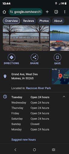 Read moreMy husband and I love to night fish due to him having heart failure and it being very difficult for him to be out exposed to the sun during the day. So we looked up fishing places near us and online it states that Raccoon river fishing pier is open 24 hours. Well we decided to go and we get there and no sooner are we getting ready to throw our poles in here comes a rent-a-cop. Tells us "folks the park closes in 10 minutes" my husband proceeded to tell him that it stated that the pier was open 24 hours. Well this rent-a-cop clearly not an out doors man won't engage or acknowledge what my husband has said but again says "the park closes in 10 minutes and all the gates will close and lock". It's one thing if it's posted closes at 1030 quite another when it's posted and enforcing...