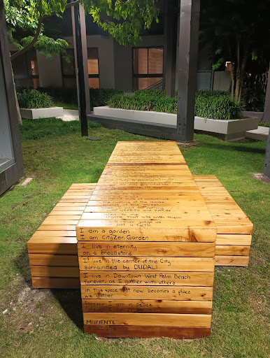 The City Zen Garden is an public art collaboration between Sherryl Muriente, her husband Beju, and Finnish artist Marco Casagrande. The project was designed as a meditation garden and it opened in December of 2018 in front of the Broadstone Apartments in West Palm Beach. The garden is part of the West Palm Beach's Art in Public Places program which requires developers to either donate to a public art fund or build public art on their site. In this case they chose to create art. The artists worked in collaboration with Alliance Residential Company which developed the apartments at the corner of Datura Street and Dixie Highway. Alliance donated 10,000 square feet of their property in order to fulfill the requirement.