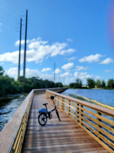 Strolled the nice sidewalk on Australian along shore & tullies, then Okeechobee road which was weary almost like a freeway shoulder, The wooden trail bridge starts where the airport exit curves off from Okee. I see why they needed this wooden bridge trail added for pedestrian safety at the curve there. Loved the wood trail lighting along its length at dusk, tho small gnats attracted to lights so walked on the side without lights, didn't feel much mosquitos but used Vevo body spray beforehand which we like. Bridge lights cast pretty shadows on the grassy tullie area at west end, looking toward evening lit buildings across lake. Safety Lighting was well lit at Okeechobee side entrance, but felt overall darker at the other end of the wooden trail bridge (less tall lights?). I recall street lights close by but still, it could use lighting to know surroundings better when exiting bridge to that dark west/north end. About...