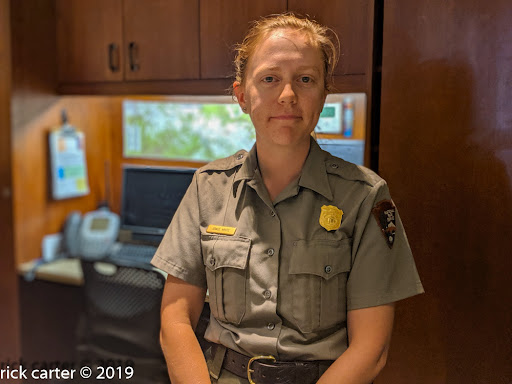Our first stop in Yellowstone and we were pleased. Inside there was a monitor with the predicted next eruptions of several geysers. How cool. We waited at the information desk while Ranger Grace White (see photo) gave 3 little kids in a family the oath (Raise your right hand. Repeat after me...) of the JR Ranger and presented them with stickers. When our turn came I offered praise for making the kids' visit a lot more fun. She explained the whole process I needed to follow if I wanted to be a JR Ranger, I thanked her, but declined. There was a big herd of elk grazing in the nicely mowed lawns behind the building and another ranger was reminding the tourists that were getting too close that elk are wild animals and they might be hurt or killed if an elk suddenly got irked. We were sitting in the our very green Charger rental car reviewing maps and making a plan when a woman stuck her head in the driver's side window and announced, "I don't want to alarm you...," TOO LATE--she alarmed us. Turns out she was letting us know she had the same car in the same color and our...