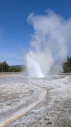 Read moreWe lucked out and caught Daisy on our hike out to morning glory pool, and it was fun! The angle of eruption gives it character compared to other geysers, and it reached up high into the sky. The other two geysers in the complex bubbled before the eruption as a preview. The eruption happened at the exact time...
