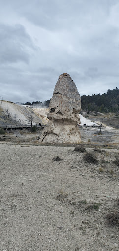 From NPS: Liberty Cap is 37 feet (11 m) tall. It was created by a hot spring that was active in one location for a long time. Its internal pressure was sufficient to raise the water to a great height, allowing mineral deposits to build slowly and continuously for perhaps hundreds of years.