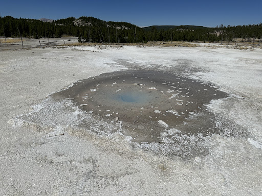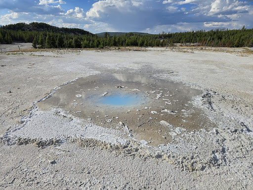I have not got the pleasure to see Pearl Geyser in action. However, the cool translucent opal/teals are legitimately one of a kind. There are so many amazing features in Yellowstone, but I don't remember seeing this beautiful hue of blue anywhere else. On a sunny day, it's almost a must to stop by and stare into...