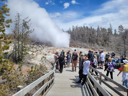 We very nearly missed seeing it, but following a snack at our van, while my family waited for me to take a quick look at Porcelain Springs, it thundered into life! The ground literally shook as though seismic activity was occurring, and you could easily hear it a mile away. As I rushed to meet my family so we could see Steamboat erupting, steam billowed high above the treetops. And throngs of people crowded and rushed to see it, as though we were at a theme park.