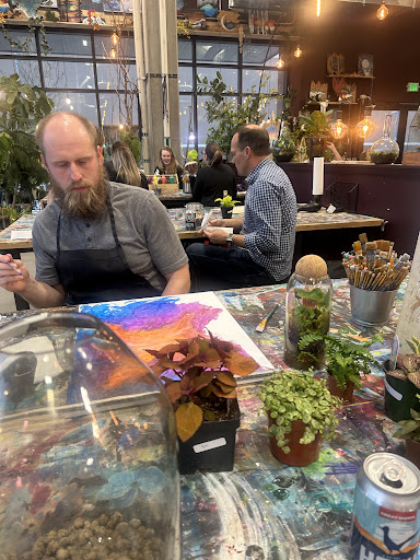 This is a fun place to go to. You can make paintings, macrame, or terrariums. There are well over 100 painting designs you can choose from that you can paint on wood slats, sliced tree trunk, or just plain canvas. Whatever design you chose, there is a person there to help you out and show what paint colors to use and how to make the designs work. There are many plants and goodies to choose from to make a terrarium. Donât much about the macrame, but with as knowledgeable as the staff was about the other things, Iâm sure they are helpful with this too. The staff was super friendly and helpful. I had a couple happy little accidents with my painting and suggestions were plentiful on how I could fix my painting. The owner was there when my wife and I were and she was great to talk with. She enjoys what she does and really makes you feel comfortable with whatever youâre working on. They do offer a wide selection of drinks, alcoholic and non alcoholic and reasonably priced. The staff brings the drinks to you! This would really be a great place to go with a group or on a date. Itâs also a good place to take a kid to do a project for mom, sheâd love it.