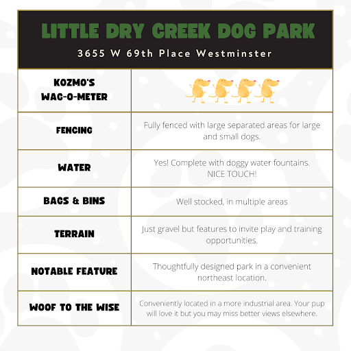 Cons: What's with the City of Westminster not believing in putting bathrooms close to their parks? Humans have to pee too! They didn't turn on the dog water fountains until August. There were several people that kept asking to get them turned on all summer long and it took them until the summer was almost over to do so?!? There's a water runoff in the middle of the park. It turns into a small lake. If it rains or snows the day/night before, be prepared for your dog to run through it and get completely soaked with mud and water. The fencing around the park stinks. If your dog is an escape artist, be prepared to...