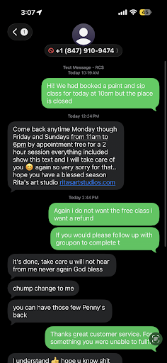 Read moreBe sure to double-check your appointment before visiting or purchasing a Groupon. I called earlier in the day to confirm if an afternoon appointment was possible. Rita answered and confirmed that she was available and accepted our request. However, when we arrived, the door was locked and she wasnât answering her phone. Later, she texted saying she was unavailable and that the appointment had been made on too short of notice â something that couldâve been communicated much earlier. I canât speak to the quality of the activities since we never got to experience them, but the lack of organization and communication was...