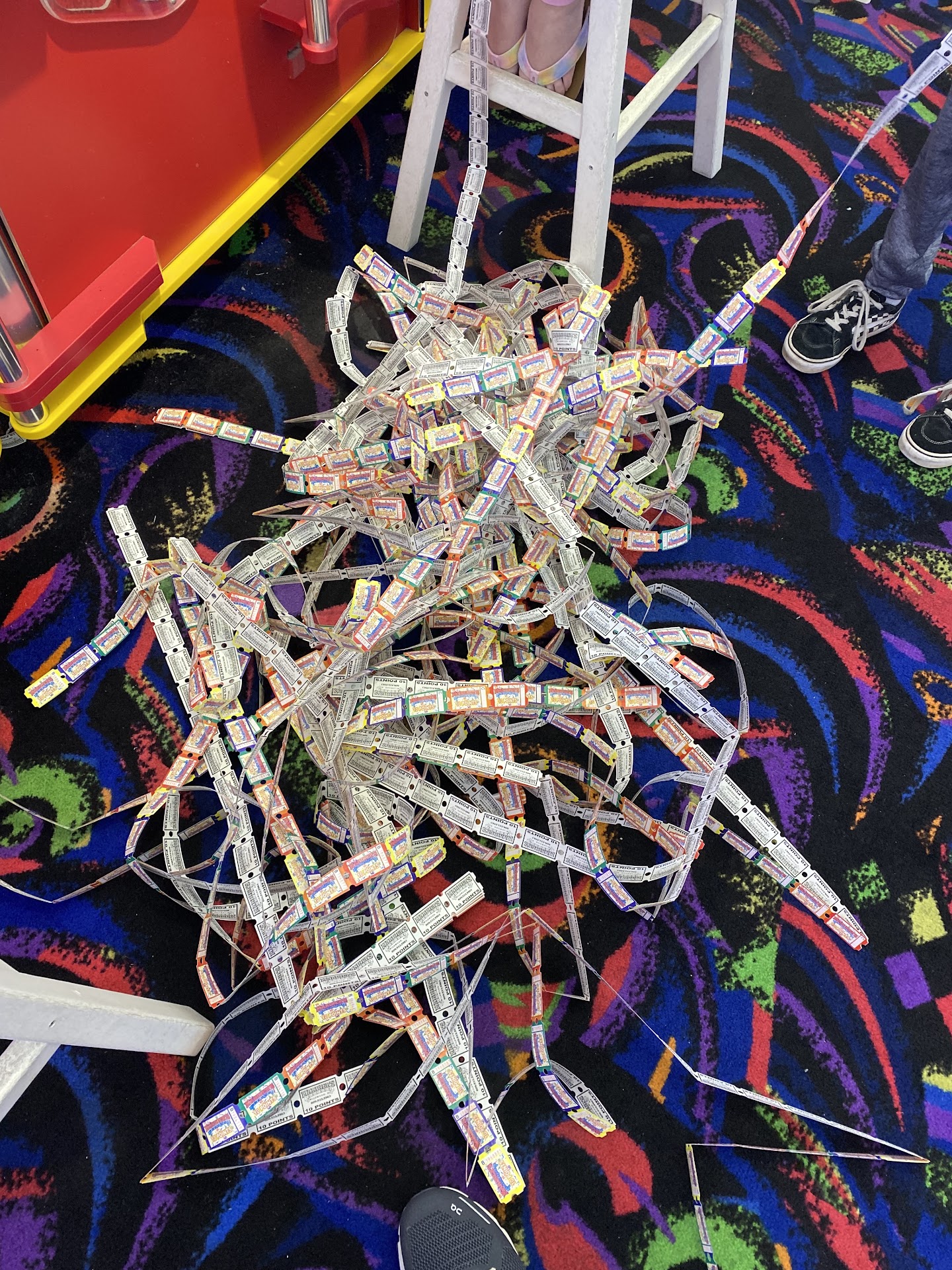 Read moreThis is where the kids had the most fun, until it came time to get prizes. There were quarter machine games. Pretty much all the games were made up the same way except for the claw machine which was another ripoff. Every half hour a man comes by and fix the toys and stuffed animals so that you can not win at all. Keep spending quarters if you like. Then the ticket cash in...OMG! The kids got 5-6,000 ticket each...but the prizes are worst than Chuck E. Cheese. A box of 8 no name brand crayons was 8,000 points...so each ticket was worth 10 points. When playing the games you had to shoot the quarter and aim it so that you can knock down certain coins that have numbers on it, and you receive that amount of tickets. Easy right? Lol, nope! Masterfully thought about ripoff games. To make more money off...