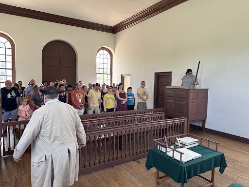 I was seated on the judge’s bench, which gave me a front-row perspective on how justice worked in the 18th century. The interpreters were very well prepared, using memorized lines to keep things moving while still letting the audience participate.