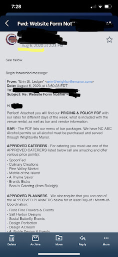 **Attached two different emails. One was to my friend and one to myself. The problem here? Lies. Wrightsville manor lied to us about which dates were available to reschedule our wedding to. The first emails were sent to my friend to see which dates were available, notice in October they told him all Thursdays are available, but when I got to Email, there are none. Funny isnât it. The emails were sent one day...