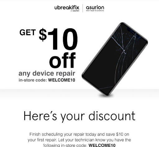 Read moreI hate leaving lower ratings, but the customer service was sub-par. I was initially supposed to get my phone fixed via the mobile repair. Technician never showed up and canceled without notifying me until I called the Winter Springs office wondering where he was. Maddie was polite and directed me to the Supervisor (Oliver) who later calls me and expresses his concern and promised to take care of my when I take it to the actual store. I go to the store in Winter Park and mention the situation to the sales rep. He jots down my information and see's the notes in the system. I also mentioned to him that there should be a note stating a complimentary discount for my inconvenience. He stated that Samsung does not give discounts for replacing screens. I said casually OKAAAY....Then why did I also get an email for a $10 discount (attached) for my first repair? Again, he tells me they don't do that. I needed the phone fixed so I pushed forward. He takes my information down, because he needed to update the Samsung 1-year warranty in the database. He asks for my email and I told him I didn't want to give it to him due to all the SPAM I would receive. He assured me there would be no SPAM. Low and behold every day since then I get uBreakiFix SPAM in my inbox. You think I was born yesterday? Brought the phone in around 1630 and had it back by 1915. Needless to say the phone was repaired, but these employees need more customer service training. Where's my $10...