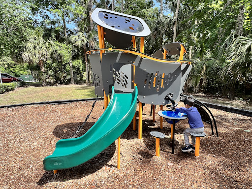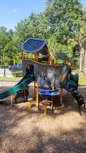 It’s a small tiny little community playground in the midst of a neighborhood No restroom No fence Near a pond with a little gator and water snake(s) There’s a lot of spiders and spider webs on the play structures The round spinning structure spins very fast. My little man got scared. Lots of shaded areas One...