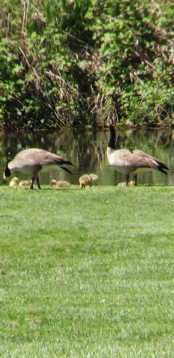 All the tables are under a roof, and there are tall deciduous trees nearby that create incredibly pleasant shade in the dry season and moderate shelter from rain at other times. There's a big lawn that goes all the way to the slough, and there are always people walking their dogs and riding their bikes on the trail. The last time I went (April '23) there were a few Canada geese looking out for a gaggle of fluffy little goslings on the bank of the slough. It really is a very nice place.