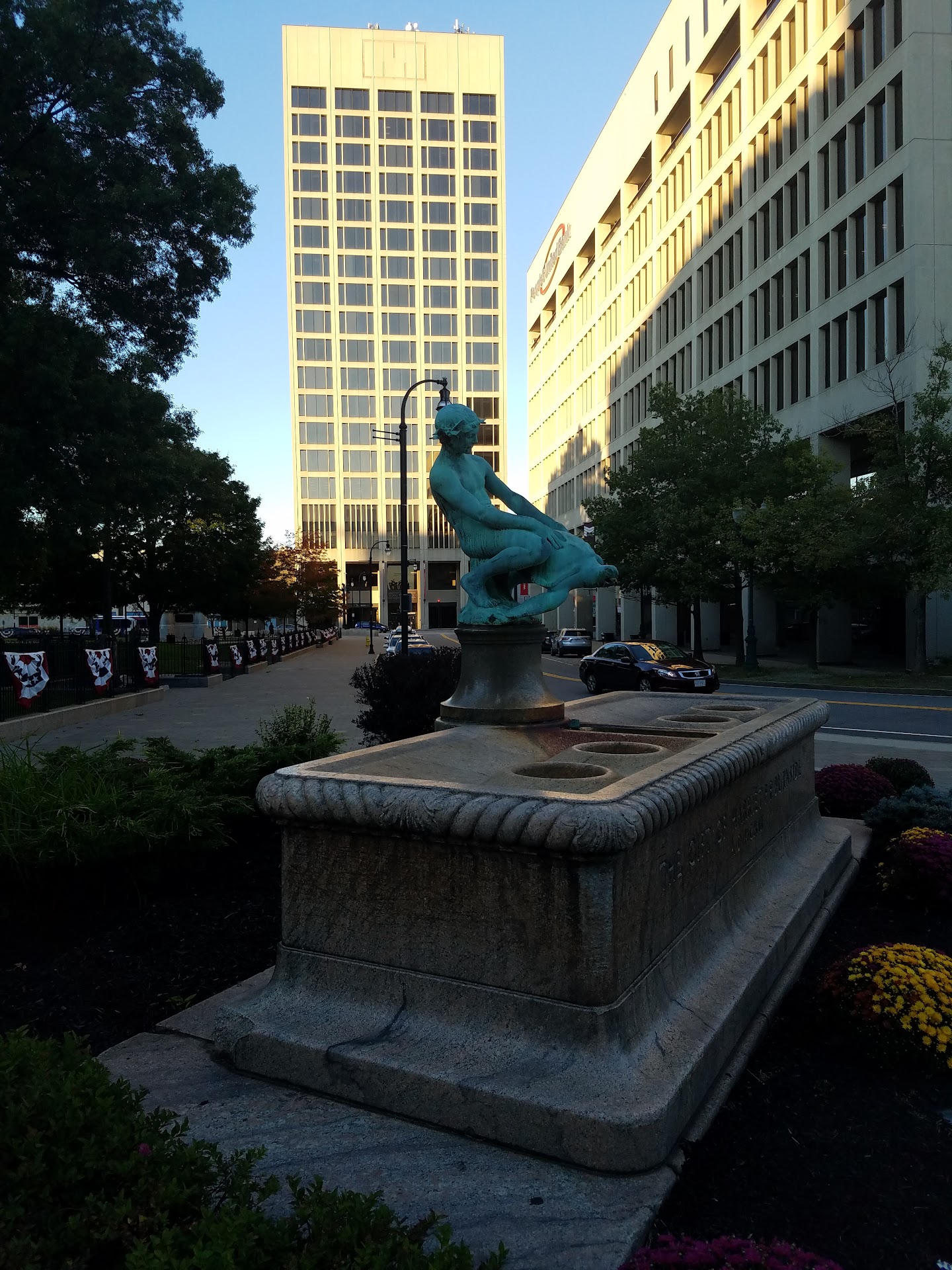 The Burnside Fountain is a non-functioning drinking fountain at the southeast corner of Worcester Common in Worcester, Massachusetts. It consists of two parts, a pink granite basin, and a bronze statue of a young boy riding a sea turtle.
