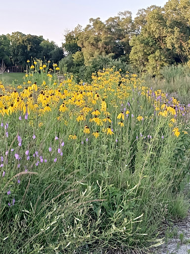 In the center where once lay a field is now a beautiful paved path, handicap scooter accessible, full of flower mounds. A natural wooden sculpture. Perfect peaceful escape right in the middle of town. The basketball court and ball diamond are off to the sides. Great with my service dog. (It IS hard to access from the parking lot for those unable to walk)