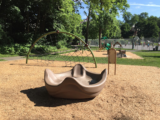 Nice playground with a larger area for bigger kids with plenty of climbing stuff and a smaller playground for smaller kids including a sandbox. There are plenty of swings including handicap capable ones. There is some shade though not much on the playground in the morning though there may be in the evening. There are a good amount of benches. Everything was in good condition. There are also basketball courts and a baseball field as well as two pavilions. It is used by a playground program in the summer so you can not be on the playground during M-F 9-12 am and 6-8 pm. Unfortunately, the signs only say the basketball court is closed during those hours, but we were asked to leave the playground as well. They were nice about it, though. For the equipment, my kids said it...
