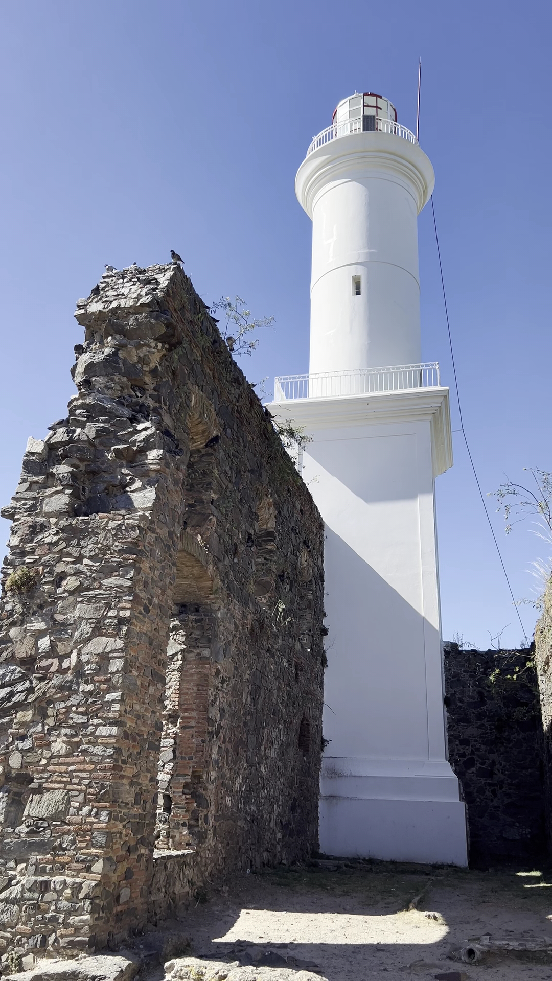 El convento fue construido por los portugueses en 1694, pero sufrió un incendio que lo dejó en ruinas. Lo que queda son los muros originales, que hoy acompañan al faro, construido mucho después, en 1857, para ayudar a las embarcaciones a evitar los bancos de arena que rodean la costa de Colonia.