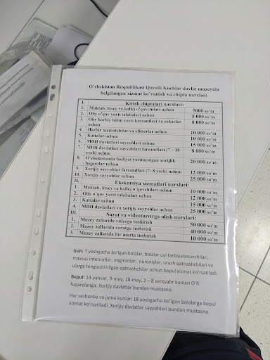 Read moreFantastic museum! Very well done and a large collection of artifacts (and many replicas), including Krupp cannon, original contracts from the Russian conquest, and even WWII war trophies. Most artifacts have labels in English, but all context and overviews are in Uzbek only. Entry 25k...