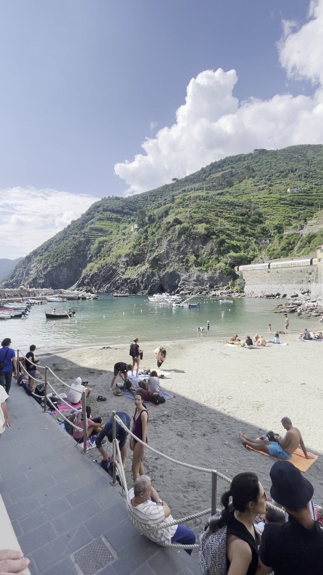 While it is the most busy swimming area of the 5 villages, this is for a reason as it is very beautiful. There is a small bay/beach type area to lay down on or a plethora of rocks around the side you can try and get comfy on (some easier than others). You can find a few smallish jump rocks which is fun. Water is crystal clear. Even while busy there is plenty of room for swimming, it's finding a spot that is hard so I recommend getting there early or...