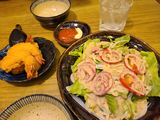 Mình gọi 2 phần tôm chiên, 1 salad, 1 udon bò, 1 cơm thịt heo xào gừng.