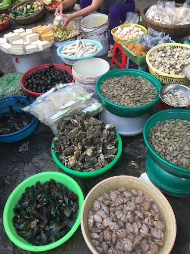 This small market is mostly for students of nearby university and colleges; thus its prices are very reasonable and not much room for bargain. Sunday afternoons my boyfriend and I often come here for a food tour with: Super delicious bánh tráng trộn (rice paper mixed with herbs, quail eggs, dried beef, mangoes, dried shrimps, fish sauce, etc.), 15,000d/pack, Bánh tráng nướng Đà Lạt (Dalat style grilled rice paper with eggs, onions, dried beef, etc.), 10,000d/piece, Snails (you should only look for Ốc hút Cô Luận, this is the best place with the best snails in Danang, or central coast of Vietnam I would say), 8,000d/dish. My boyfriend and I normally have 4 dishes with a grilled rice paper (2,000d each) = 34,000d. Noodles mixed with pork skin, bananas flowers, herbs, peanuts, etc. served with grilled rice paper. 10,000d/portion. I normally ask for no oil and no chilli pepper sauce, if you don't like oily food and spicy food like me, remember to remind the shop owner to not put these rhings to your dish. Bánh đập (one grilled rice paper topped with a retangular or round piece of flat and thick noodles, served with mắm nêm - a strong smell kind of fish sauce in central coast areas of Vietnam), 2,500d/pack. One dish is 10,000d with 4 packs. Bánh mỳ bột lọc (bread with bột lọc inside), 10,000d, you can buy from the same shop with bánh đập. Avocado ice cream (remember to look for Kem bơ Cô Vân - avocado ice cream Cô Vân, there are several places that sell avocado ice cream inside the market, but this shop offers the best. 10,000d/cup. Juice with fresh seasonal fruits (apples, pineapples, strawberries, guavas, mangoes, etc.) 10-15,000/cup And tons of other things nearby like bánh bèo, bánh nậm, bún mắm, bún thịt nướng, bánh căn, bánh ram ít, bánh canh, etc. Cost is around 10-15,000d/dish.