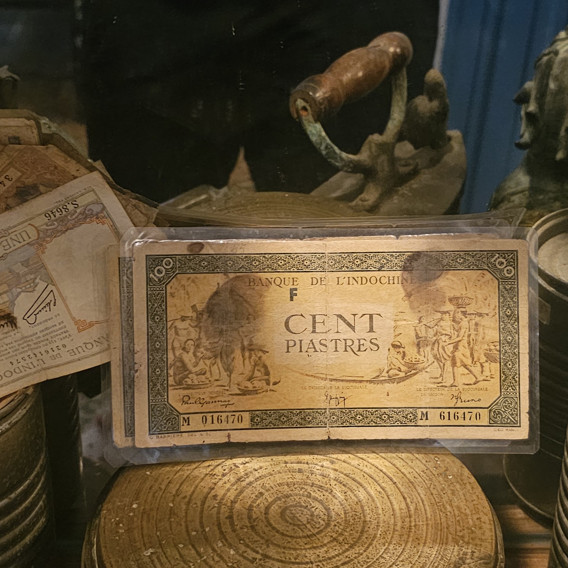 The decor? Flamboyant and fabulous. From antique rice baskets that outclass my entire kitchen, to a single piastre note that reminded me money used to have style. Even the lighting fixture looks like it belongs in a Bond villain’s lair.