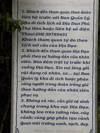 Read moreĐịa đạo Phú Thọ Hoà, nay thuộc phường Phú Thọ Hoà, quận Tân Phú, thành phố Hồ Chí Minh. Từ xưa, nơi đây là vùng đất chịu ảnh hưởng của nhiều phong trào yêu nước tự phát như: Bề Ðường (Nguyễn Văn Bường), Thiên Ðịa Hội (Phan Phát Sanh), Hội kín Nguyễn An Ninh... Sau ngày 23-9-1945, Phú Thọ Hòa trở thành một trong những căn cứ địa thời chống thực dân Pháp. Tiền thân của địa đạo, là những căn hầm bí mật được đào từ những năm 1930, để bảo vệ và che giấu cán bộ cách mạng của địa phương. Năm 1947, tiến hành đào địa đạo tại thôn Lộc Hoà vì nơi đây, có những đặc điểm như sau: Mô đất cao, cây cối rậm rạp, địa hình địa chất phức tạp, nhân dân có truyền thống cách mạng vững chắc.