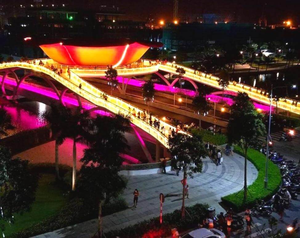 Một điểm cộng lớn nữa là hồ cảnh quan và cầu bộ hành trong công viên – nơi check-in cực kỳ hot của giới trẻ. Hồ nước rộng, phản chiếu trời xanh và những toà nhà phía xa, tạo nên cảm giác vừa hiện đại vừa yên bình. Đặc biệt, buổi tối công viên lên đèn rất đẹp, không gian trở nên lung linh, thích hợp cho cả đi dạo đôi lẫn tụ tập bạn bè.