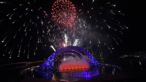 A Fun Water Show for Kids, But Don’t Expect Too Much Since the water show is free when you book a hotel stay, it’s understandable not to expect the same level of production as paid performances like Sun World or Disneyland shows. However, this show combines water, fire, and fireworks with 3D animation and space-themed visuals, which makes it an exciting spectacle, especially for children.