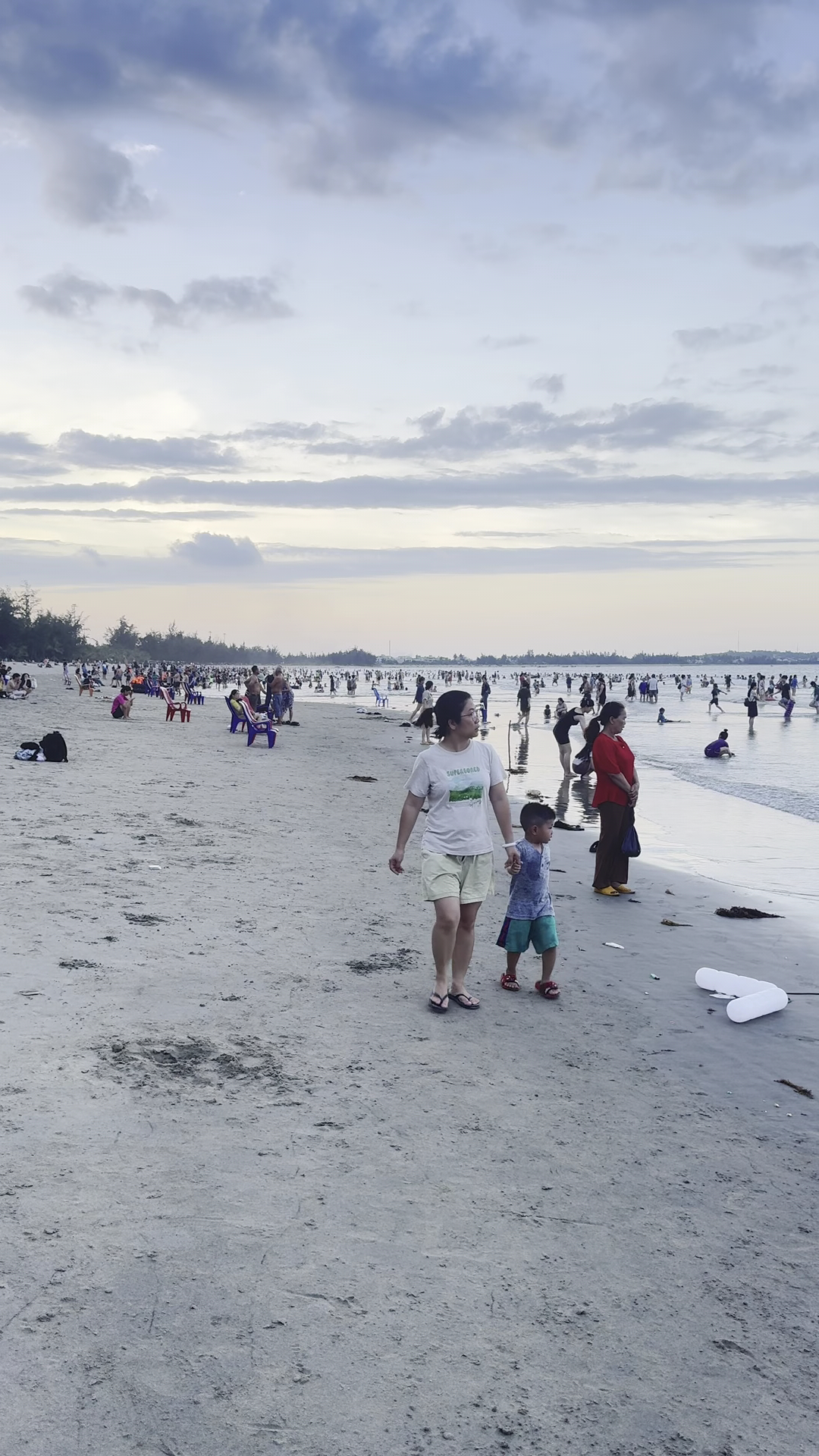 The beach stretches out with fine golden sand, gently kissed by the waves of the East Sea. The water is warm, clean, and calm—ideal for a refreshing swim or a long, barefoot stroll along the shore. Early in the morning, you’ll find local fishermen hauling in their catch and children playing by the surf, giving the beach a charming, lived-in feel.