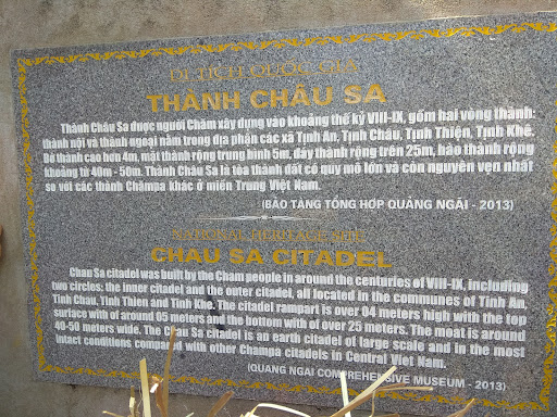 Read moreThành cổ Châu Sa hay Amaravati là thủ đô của Vương quốc Amaravati, được người Chăm Pa xây dựng bằng đất vào thế kỷ thứ 9 tại xã Tịnh Châu, TP.Quảng Ngãi, tỉnh Quảng Ngãi, Việt Nam. Đây là loại thành Chăm bằng đất duy nhất ngày nay vẫn còn dấu tích.