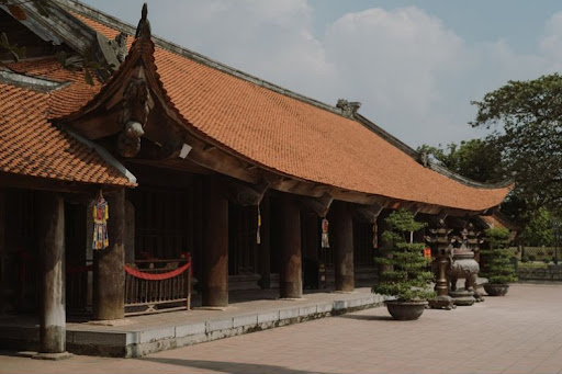 Từ trên mặt đê đi xuống qua bậc tam cấp, gặp một sân nhỏ lát đá tảng, công trình đầu tiên là tam quan ngoại. Rẽ phải, hoặc trái theo con đường men theo hồ nước hai bên tả, hữu gặp hai cổng tò vò, giữa là tam quan nội. Điều đáng quan tâm nhất ở tam quan nội là bộ cánh cửa gian trung quan – một kiệt tác chạm khắc gỗ thế kỷ XVII. Từ tam quan nội, qua một số sân nhỏ rộng ta đến khu chùa phật gồm Chùa ông Hộ, tòa thiêu hương (ống muống) và điện phật.