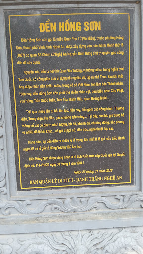 Read moreĐền Hồng Sơn, còn được biết đến với tên gọi Võ Miếu Linh Từ hay miếu Quan Công, là một di tích lịch sử – văn hóa cấp quốc gia, tọa lạc tại phường Hồng Sơn, thành phố Vinh, tỉnh Nghệ An. Ngôi đền này được xây dựng vào năm Minh Mạng thứ 18 (1837) để thờ Quan Vân Trường – vị tướng nổi tiếng thời Tam Quốc, biểu tượng của lòng trung nghĩa và dũng cảm. Ban đầu, đền có tên là Võ Miếu Linh Từ, sau này được gọi là đền Hồng Sơn theo tên địa phương.