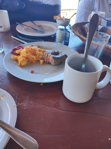The picture is of breakfast: scrambled eggs,under done sausage,had to use a fork to stir my coffee as there were no spoons and oh yes cutlery was delivered 20 min after an already cold breakfast was brought to the table.
