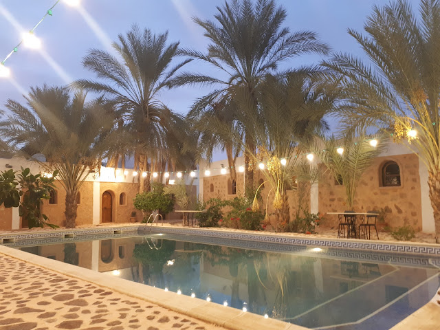 It was a really good choice, in the middle of the desert and palms. I could not imagine a better place especially when it was as hot as between 45-50 degrees, it felt cool there. With a pool I really had for myself when we were the only guests apart from 2 days. Not many people in the middle of the summer are traveling to the Sahara. I also liked being alone there, feeling really relaxing. Quiet and calm. Had a neighbor a falcon there too.||We have stayed there 3 full days, 4 nights and I regret that we did not stay one day more instead of going back to Algiers.||The wifi worked well too, though sometimes there was connection for the whole Ghardaia out.||However, the breakfast could be better, there was some yogurt and cheese, but day after day it was less and finally not even yogurt, just bread, jam and crossaint that I'm not so fond of having to breakfast.||We also got a dinner there, but it was a little bit expensive, I can say, 2000, - per person was too much. Too bad we did not get any Algerian specialty, just turkey or meat, but that was good anyway.||The man who took care of the place has also arranged a guide for us to begin with, because I thought Ghardaia was like a maze, but after two days we stopped using him and went for our self and found good for all the interesting places. The guide was not so happy of course, but I do not like to have a guide, like to explore and explore places myself and as soon as I can, I want to get rid of them.||Everyone there was really helpful and despite we could not one single word in French all was going good...