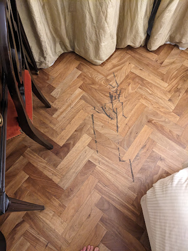 Now, the less good. I was not familiar with NH Hotels as a brand and didn't know what to expect, but it surprises me that this can be considered a 4 star hotel. It is shabby. Carpet in the hallway is stained. Wallpaper is peeling at the seams and stained dark around the light switches. While the hardwood floors were maybe once visually striking, the ones in our room were badly scuffed and stained. The floor was dirty. There was dust and even a few staples on the floor, like it had not been swept. Beside the bed there were sticky spots that turned my napkin black when I scrubbed them off. We ended up taking a wet towel with some soap to wipe down the floors ourselves, and the towel came away with dirt marks on it. Did not feel comfortable walking around without my shoes on, which is just not what I would expect from a 4* hotel.