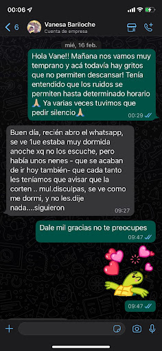 En base a tu respuesta, me gustaría aclarar que en el complejo sólo había una familia en el momento en el que ingresamos con la grúa, que nos ayudó muy gentilmente con herramientas y a mover el vehículo, EL RESTO DE LAS FAMILIAS LLEGARON CUANDO ESTABA TODO SOLUCIONADO. Vos te encargaste de contarles a cada cabaña nuestro inconveniente, los pasajeros se encargaron de acercarse a ofrecernos su ayuda (de parte de ustedes no recibimos ni un mensaje disculpándose por los malos tratos). En tu respuesta, muy tranquila me decís que tuviste que ir a disculparte con quienes se hospedaban en el resto de las cabañas por los ruidos que nosotros ocasionamos MOVIENDO EL AUTO CON UNA GRÚA PORQUE TUVIMOS UN INCONVENIENTE!!!... es lamentable tu respuesta ya que vivimos un momento muy feo, y además lo que decís es imposible porque no había nadie en el momento de lo ocurrido. A esto agrego que una noche te envié mensajes por ruidos molestos a las 00:30 AM (ADJUNTO IMAGEN), y vos te disculpaste diciendo que los inquilinos que estaban junto con nosotros, hacían ruidos molestos a diario y tenían varias quejas. Soportamos ruidos todos los días hasta prácticamente las tres de la mañana, y los desubicados somos nosotros por ingresar a las 22:00 con una grúa???