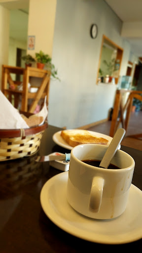 Desayuno para dos: dos medialunas, cuatro tostadas para los dos, y un café para cada uno.