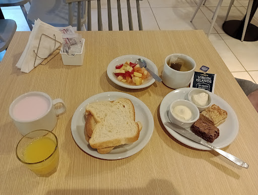 Para empezar el desayuno es completo. Mi clásico era yogur, ensalada de frutas, tostadas con mermelada/queso, jugo de naranja y algún cuadradito dulce (brownie/manzana). Todo fresco y muy rico. Uno se sirve lo que quiere (y lo que va a consumir, seamos responsables) y cuantas veces quiera. Recomiendo ir temprano porque después se llena y hay que hacer fila para entrar.