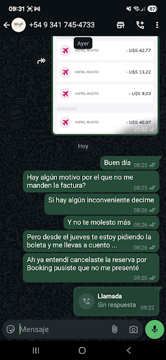 Hola mi nombre es Damián hice la reservación por Booking el día jueves 31, 89 dólares dos habitaciones para 4 adultos llame por teléfono para decir que llegaba tarde me avisaron que la tarjeta no tenía fondos, en la tarjeta tenía 100 dólares le dije que en Booking me figuraba a 89 las habitaciones y que si le podía pagar en dólares saldaba la cuenta cuando llegara, al llegar me dicen que las habitaciones valían 147860 pesos argentinos que serían al cambio de ese día 115 dólares le dije que no que en Booking figuraba a 89 pero que le pagaba cuando llegara... Al llegar al hotel los dueños no le atendían el teléfono a la chica de la recepción entonces le pedí que me devolvieran la plata que me había descontado de la tarjeta de débito unos 40 dólares me respondió que no podía entonces le dije que me quedaba y al día siguiente solucionaba con el dueño.... Al día siguiente me encuentro que en la tarjeta me habían descontado 99 dólares y faltaban para completar el pago unos 12 si mal no recuerdo.... Les he pedido la factura desde el viernes para presentar en mi trabajo y me llevan a cuentos... Ahora intenté hacer el reclamo en Booking y ellos cancelaron la reservación... Llamo y no me atienden les mando mensaje y no me...