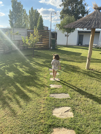 La habitación tiene aire acondicionado, pero en la cabaña que estábamos la pieza daba al este y entraba muchísima luz a primera hora. La perra tampoco ayuda al descanso, porque si bien es mansa, le gusta ladrar. La pileta impecable, ídem la parrilla y los sillones de afuera. Tiene un gran espacio parquizado que es muy bello y lugar donde dejar el vehículo. En el baño no hay donde dejar los elementos de higiene personal. La cocina no está provista para cocinar. El wifi no anda bien. Albardón es tranquilo, esta muy cerca de San Juan capital y tiene viñedos...