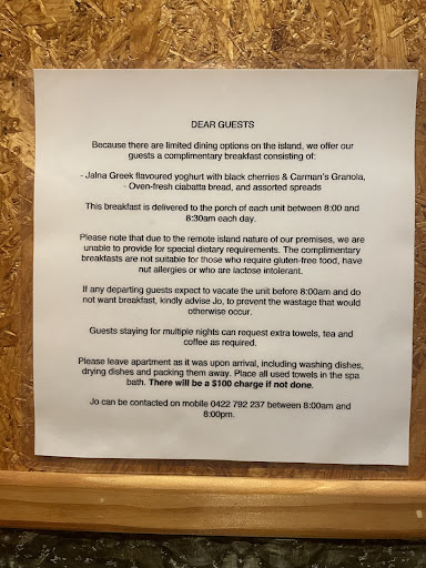 We received a nice bottle of Tassie red wine in the room on arrival and breakfast the next morning was simple but delicious. It consisted of a freshly baked bread roll, selection of jams and yoghurt. Breakfast is delivered outside your studio between 8 and 8:30am.