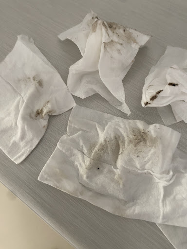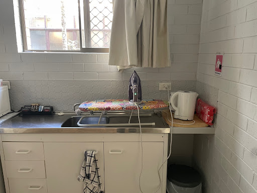 The kitchenette was completely unrenovated and equipped with two drinking glasses: a middy glass and a schooner glass, which I assume had been borrowed from the pub next door. Apart from two wine glasses, two K-mart cups, some crockery, and two sets of cutlery, there was an exceptionally blunt kitchen knife and an old and very well-used wooden spoon. One of the cereal bowls was strategically placed under the leak from the sink above. There was a microwave, toaster, kettle and sandwich maker, none of which be used. The kitchen curtain fell off the tracks.