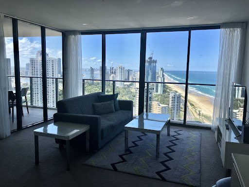 I booked this on a whim a year ago and I haven't looked back! This is our second stay at this prim located hotel 550m north of Cavill at the end of surfers paradise beach and the beginning of Main beach in a stretch of coast called narrow neck. It has a tram stop right out front so if the 10 minute stroll along the board walk to surfers puts you off then the 50cent tram (2 short stops from Cavill) makes up for it. It is also a 10 minute walk or 1 tram stop away from main beaches popular way street and shopping area tedder ave. The hotel is a beach front property boasting full glass floor to ceiling views of the main beach on its northern side if you purchase an ocean view apartment in this orientation. The rooms are modern, super clean and have all the mod cons of a modern apartment including a full working kitchenette and laundry. These ocean view rooms have fantastic balconies perfect for relaxing while checking the surf. These are one bedroom spacious apartments. The hotel also has a lovely but smaller pool area with spa, sauna and steam room. In site secure parking is free and is located underneath. The top floor (41) has a panoramic relaxing bbq area which we made the most of for lunch and afternoon drinking. There is no bar onsite so byo needed. There is also a wonderful cafe/fully licensed restaurant on the ground floor.
