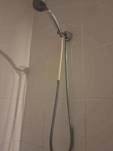 The bathroom duplicated the bedroom in size with a walk-in shower adjacent to a full size and deep bath. A large vanity area and toilet completed the personal grooming section and tucked away in a well planned nook was a 1/2 size laundry sink, washer and wall mounted dryer. A cupboard held cleaning equipment together with iron and ironing board. The double access, from the bedroom and also the main walkway near the entrance, makes this bathroom space really user friendly.
