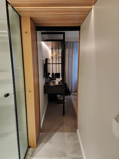 The room was very modern and spotlessly clean. The bedroom area was spacious enough although only had a chair at the small desk, rather than any form of armchair, and the wardrobe is open to the room. The Nespresso coffee machine was a nice touch and there was a mini bar stocked with some milk. Lighting in the room was superb and electric sockets present at both sides of the bed.