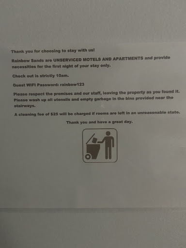 Read moreStayed for 2 nights Room was a nice size. Wi-Fi worked well Room came with fridge, microwave and kettle Comfy beds Tv in the room Balcony area to sit by the pool Location is ok for where it is. There’s a chippy nearby along with a local supermarket. Close to the beach. A good location if you want to go to Fraser Island for the day. Lots of tour companies will pick you up from near by Downsides - room seemed very dusty on arrival No one was there to check us in when we arrived at 2pm. You have to phone his number that’s on the door which is an added cost. (Roaming charges) Pool looked dirty Hot water just didn’t seem to work on the last morning before checkout. Couldn’t shower due to this Bizarrely the room next to us was just left open throughout our stay. Made us feel uneasy. Just seemed very odd. You have to empty your own bins before checkout, otherwise you get a cleaning fee added after your stay. Lots of signs in the room about added charges, see below. Doesn’t feel very...