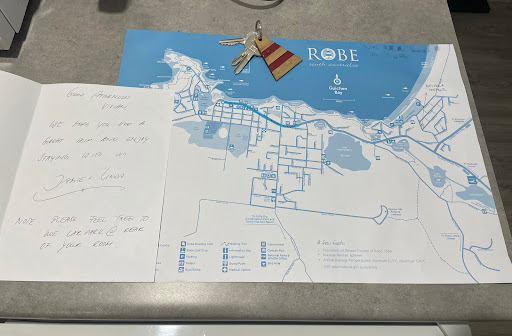 This was the first and only place where the owner wrote a personal welcome note, which truly touched me. Linda also prepared a map of Robe, thoughtfully highlighting the Main Street. The cabin was filled with meaningful gestures: a nightlight in the bathroom, a smart TV, books, board games, and brochures about local attractions.