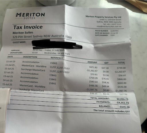 I stayed at Meriton Pitt Street for 4 nights with a total room charge of AUD 2,816, including GST of AUD 535. Initially, I intended to pay via bank transfer, as I have an Australian bank account, which would help me avoid currency conversion fees and international credit card charges. I was informed by your staff that this was acceptable, especially since it was a Friday and the transfer would likely clear by Tuesday. I was still asked to pay a credit card first deposit of AUD 2,263.97, which was charged on 11 July.