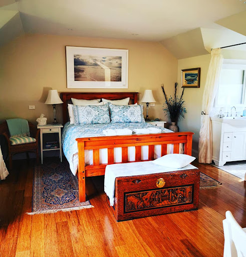 Janet showed us around the gardens and the loft where we were staying was amazing. It was in immaculate condition, light, bright and airy. The bed was SO comfortable, and the linens (sheets and towels) were top quality. The little bits and pieces were lovely something EXTRAS - sherry and dark chocolate, a DVD collection, books, books, books, a small jar of melt-in-your-mouth shortbread. It was very quiet and we loved that the shower had a little window that looked over the green paddocks and sheep.